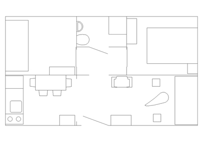 Der Bungalow hat eine gesamt Größe von 35m² die sich auf ein Kinderzimmer, Schlafzimmer, Wohnzimmer, Küche und Bad aufteilen.